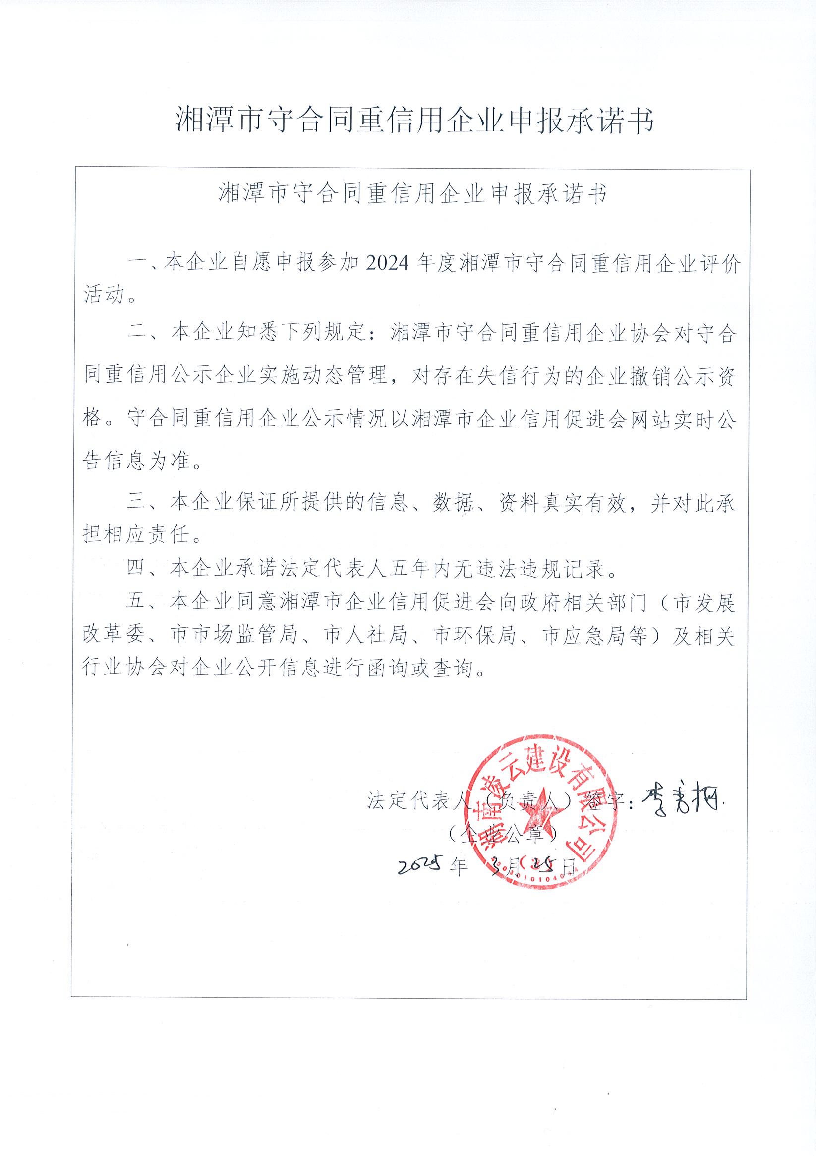 本企業(yè)根據(jù)《湘潭市守合同重信用企業(yè)申報(bào)規(guī)定》等編制 2024 年度企業(yè)信用報(bào)告書,并保證本報(bào)告書內(nèi)容真實(shí)、準(zhǔn)確、完整。