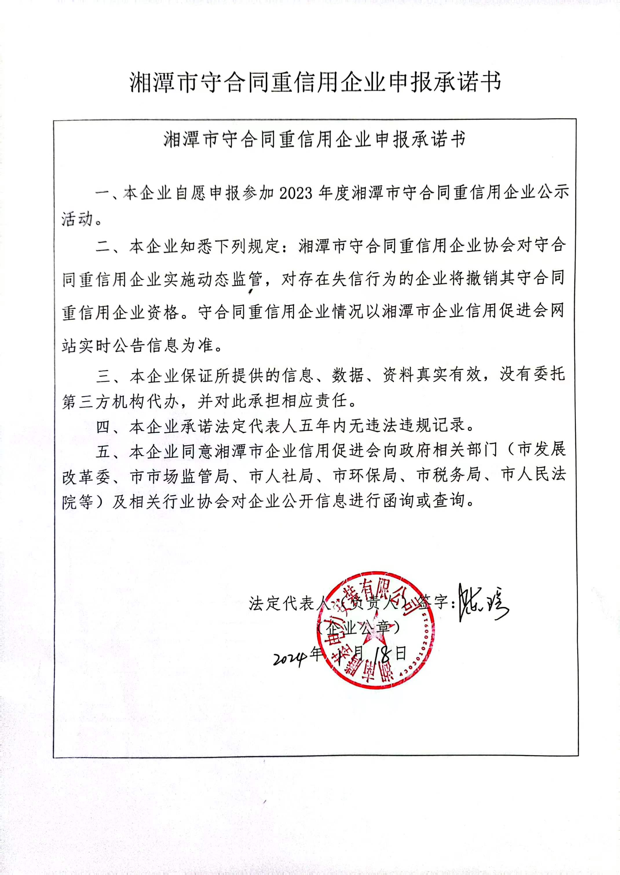 本企業(yè)根據(jù)《湘潭市守合同重信用企業(yè)申報(bào)規(guī)定》等編制 2023 年度企業(yè)信用報(bào)告書,并保證本報(bào)告書內(nèi)容真實(shí)、準(zhǔn)確、完整。
