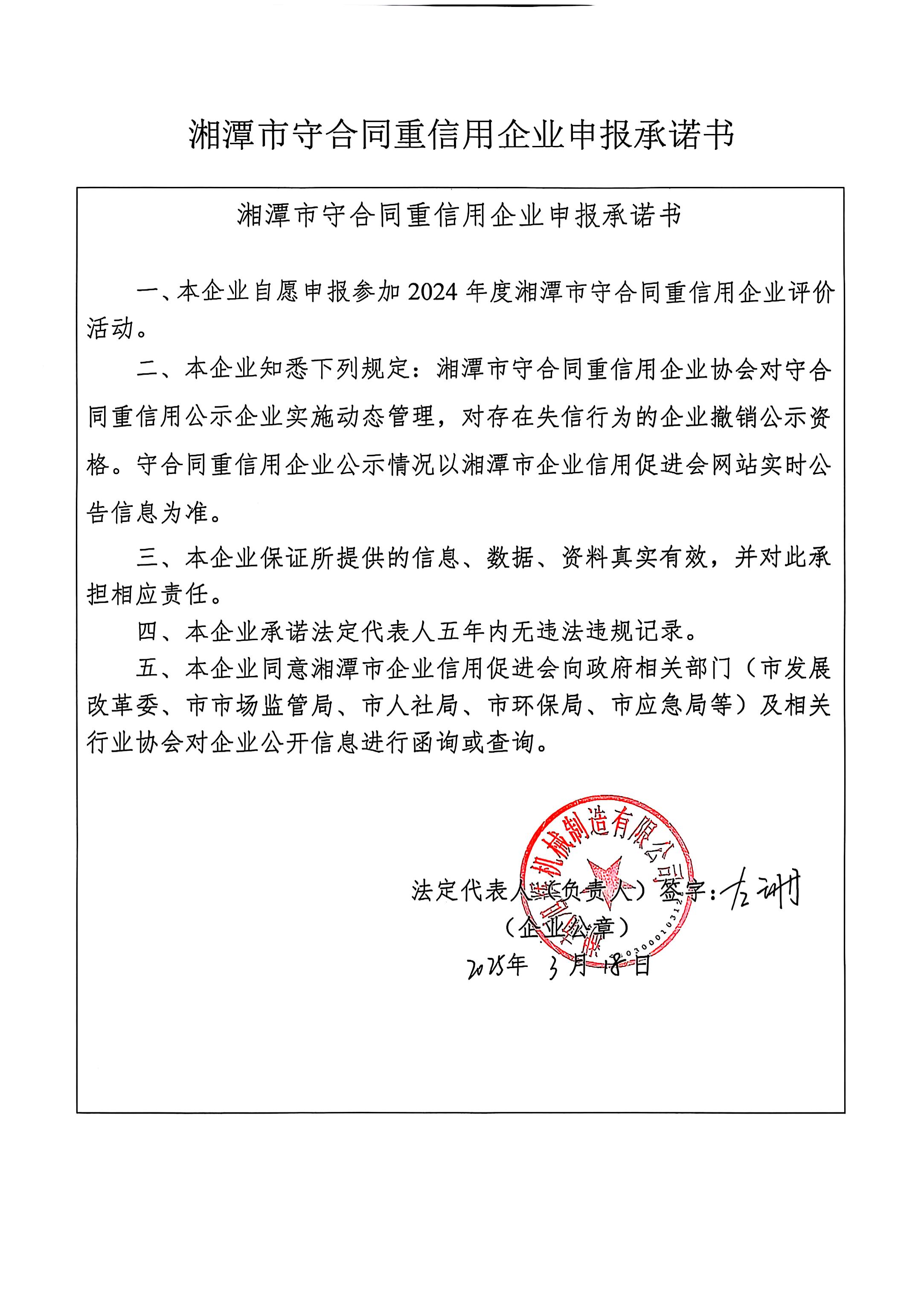 本企業(yè)根據(jù)《湘潭市守合同重信用企業(yè)申報規(guī)定》等編制 2024 年度企業(yè)信用報告書,并保證本報告書內(nèi)容真實、準(zhǔn)確、完整。