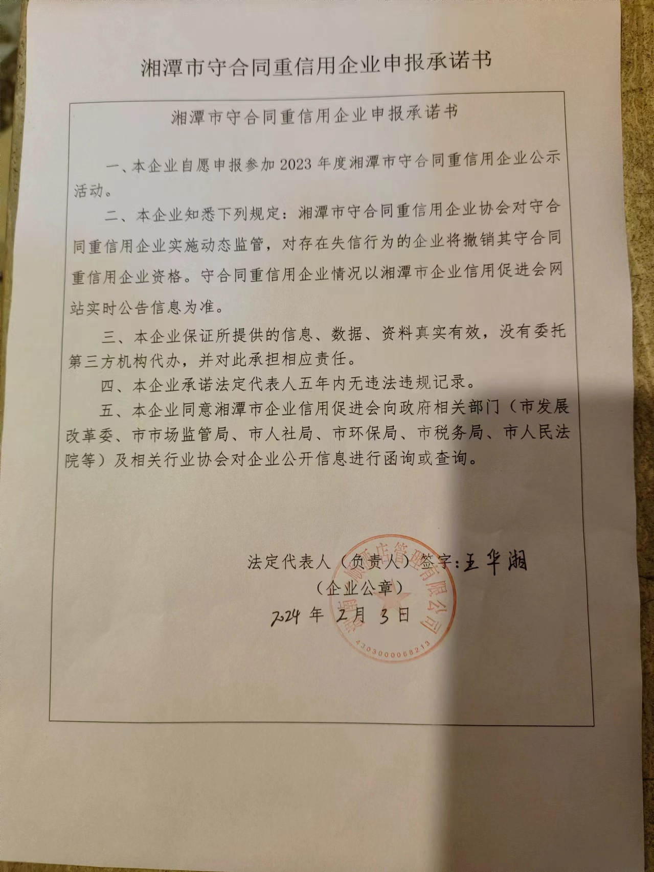 本企業(yè)根據(jù)《湘潭市守合同重信用企業(yè)申報規(guī)定》等編制 2023 年度企業(yè)信用報告書,并保證本報告書內(nèi)容真實、準(zhǔn)確、完整。