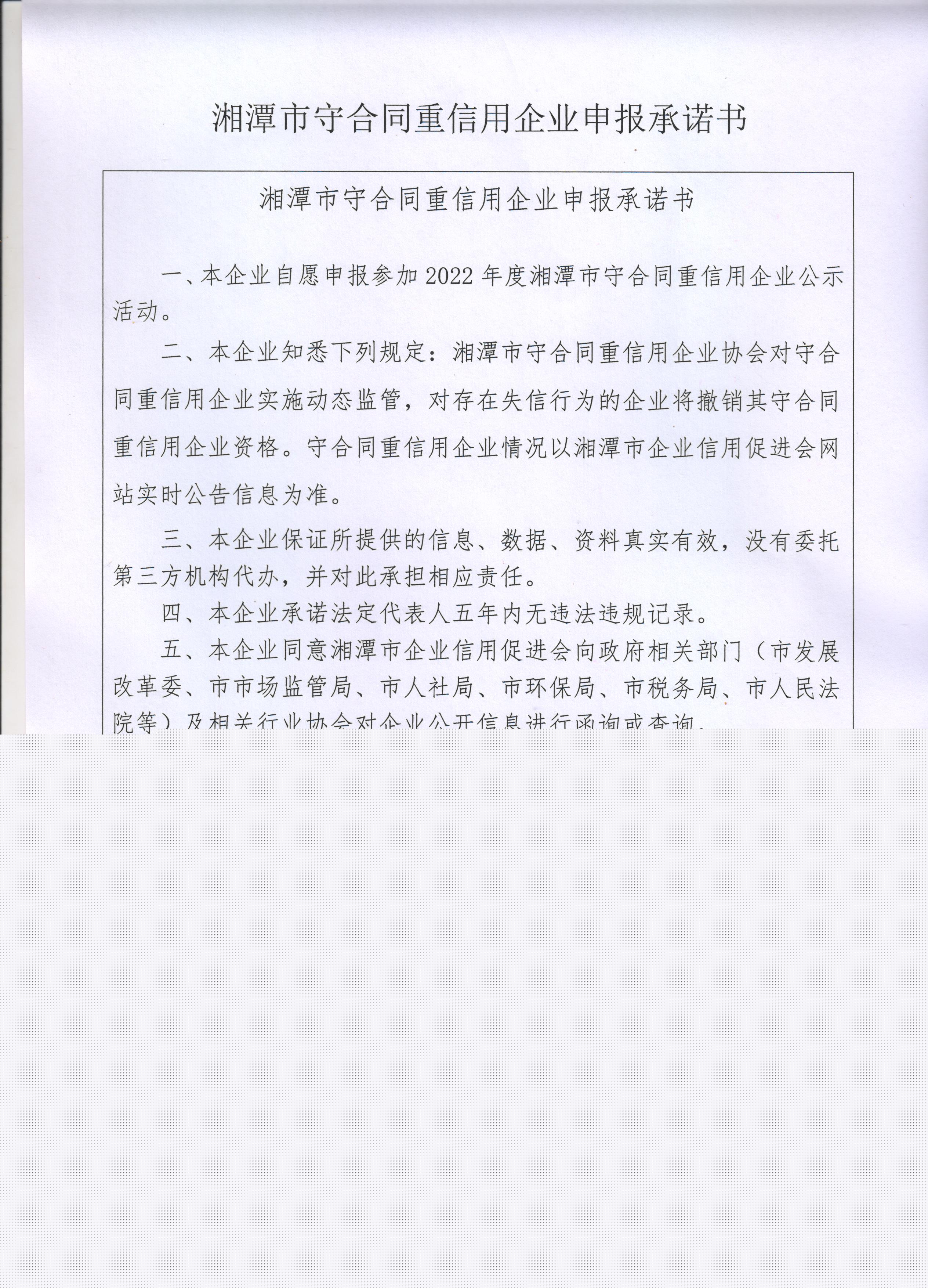 本企業(yè)根據(jù)《湘潭市守合同重信用企業(yè)申報規(guī)定》等編制 2022 年度企業(yè)信用報告書,并保證本報告書內(nèi)容真實、準確、完整。