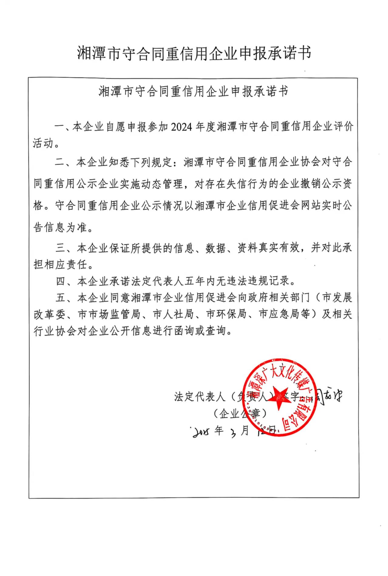 本企業(yè)根據(jù)《湘潭市守合同重信用企業(yè)申報(bào)規(guī)定》等編制 2024 年度企業(yè)信用報(bào)告書(shū),并保證本報(bào)告書(shū)內(nèi)容真實(shí)、準(zhǔn)確、完整。