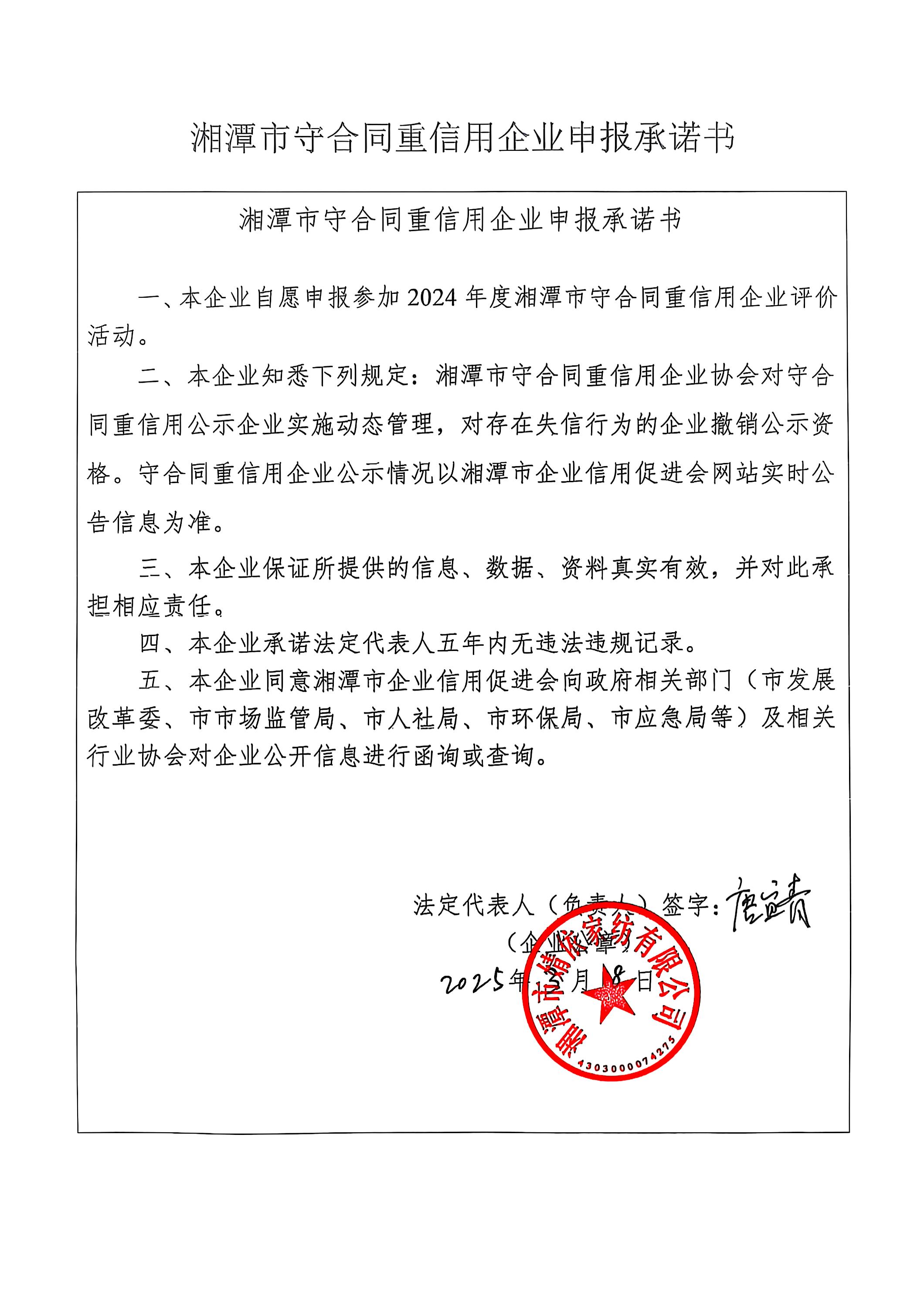 本企業(yè)根據(jù)《湘潭市守合同重信用企業(yè)申報(bào)規(guī)定》等編制 2024 年度企業(yè)信用報(bào)告書,并保證本報(bào)告書內(nèi)容真實(shí)、準(zhǔn)確、完整。